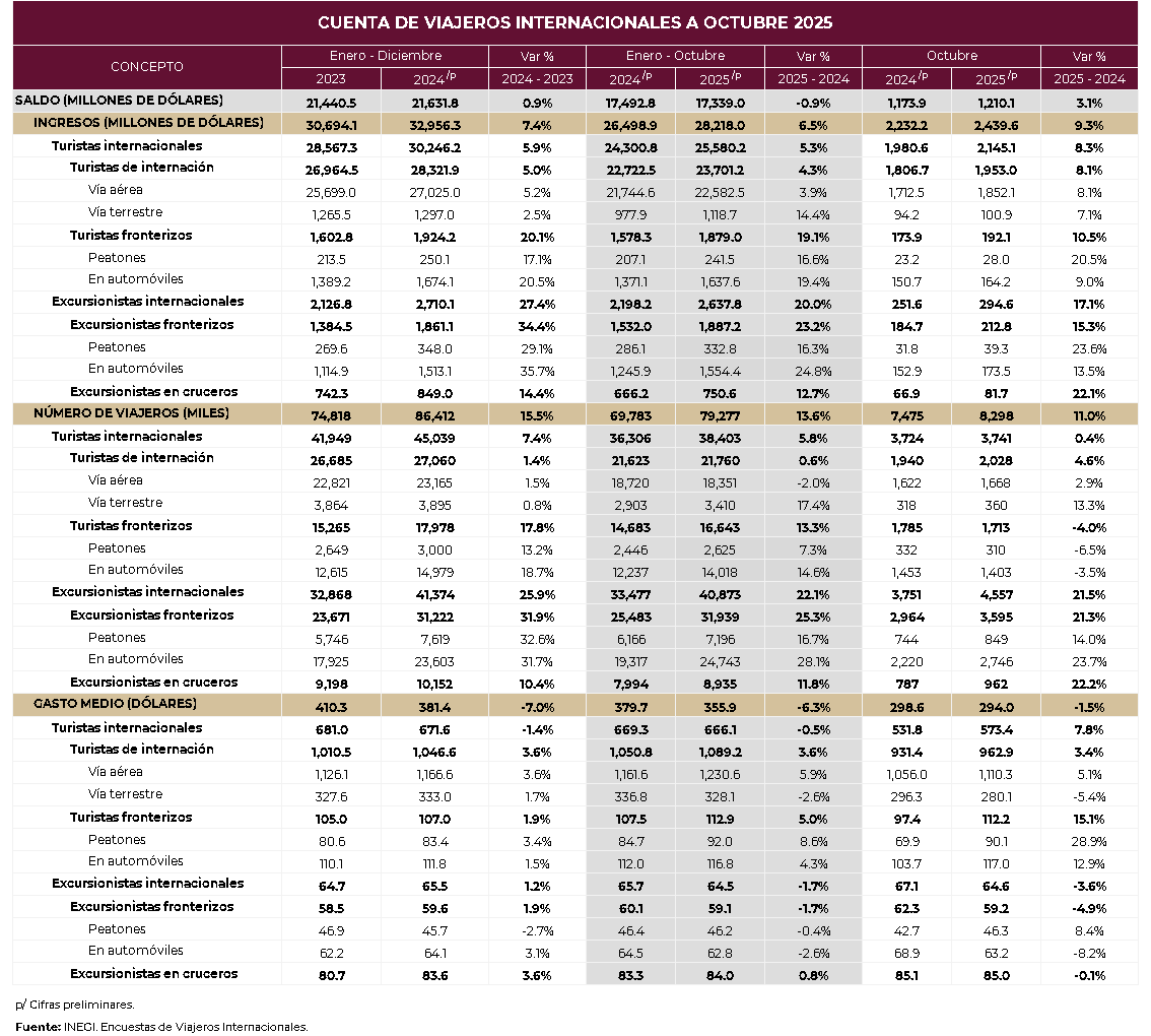 con dos meses de oportunidad, se presentan las cifras sobre la llegada de visitantes internacionales a nuestro país, así como derrama económica.