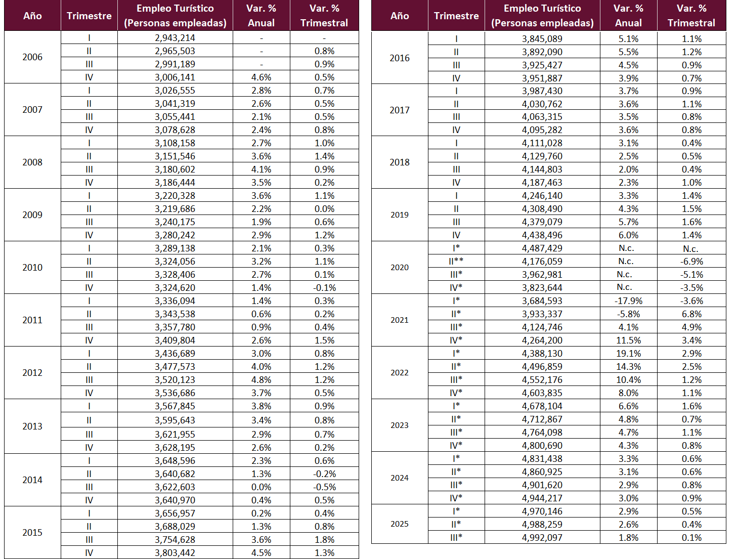 *A partir de la publicación del primer trimestre de la ENOE Nueva Edición (ENOEN). (17 de mayo de 2021), en las cifras trimestrales de 2020, 2021, 2022, 2023, 2024 y 2025, los factores de expansión responden a la nueva estimación de población del Censo de Población y Vivienda 2020, en lugar de las cifras de las proyecciones poblacionales que se venían utilizando desde 2013. (Nota informativa del INEGI https://www.inegi.org.mx/contenidos/programas/enoe/15ymas/doc/nota_sobre_cambios_estimacion_poblacion_enoe_n.pdf)